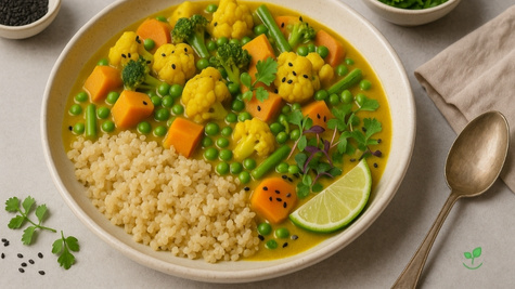 Sirva uma base de quinoa fofa, cubra com o curry e finalize com sementes de gergelim preto, coentro fresco e microverdes. Coma devagar, em silêncio, sentindo o aroma e a textura.